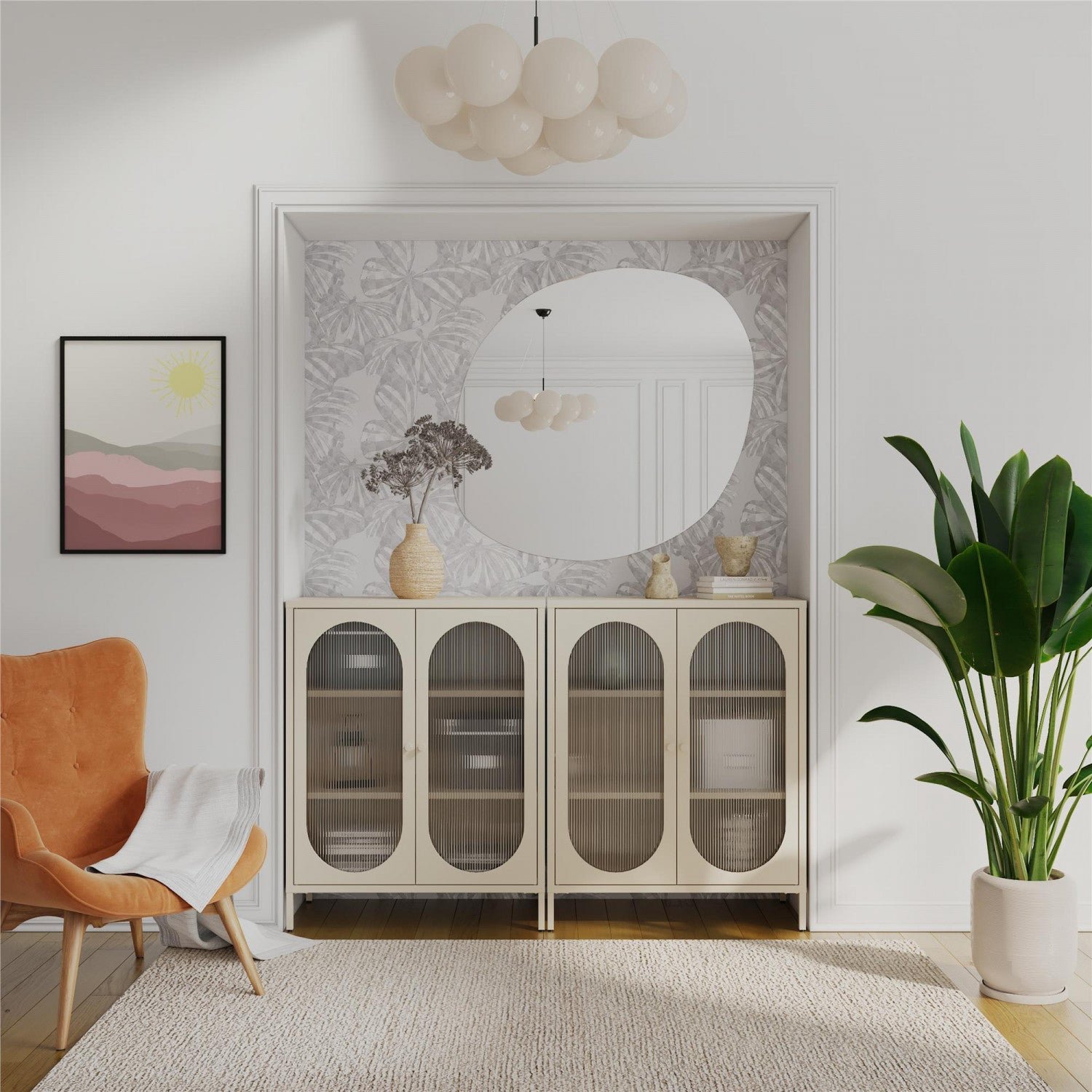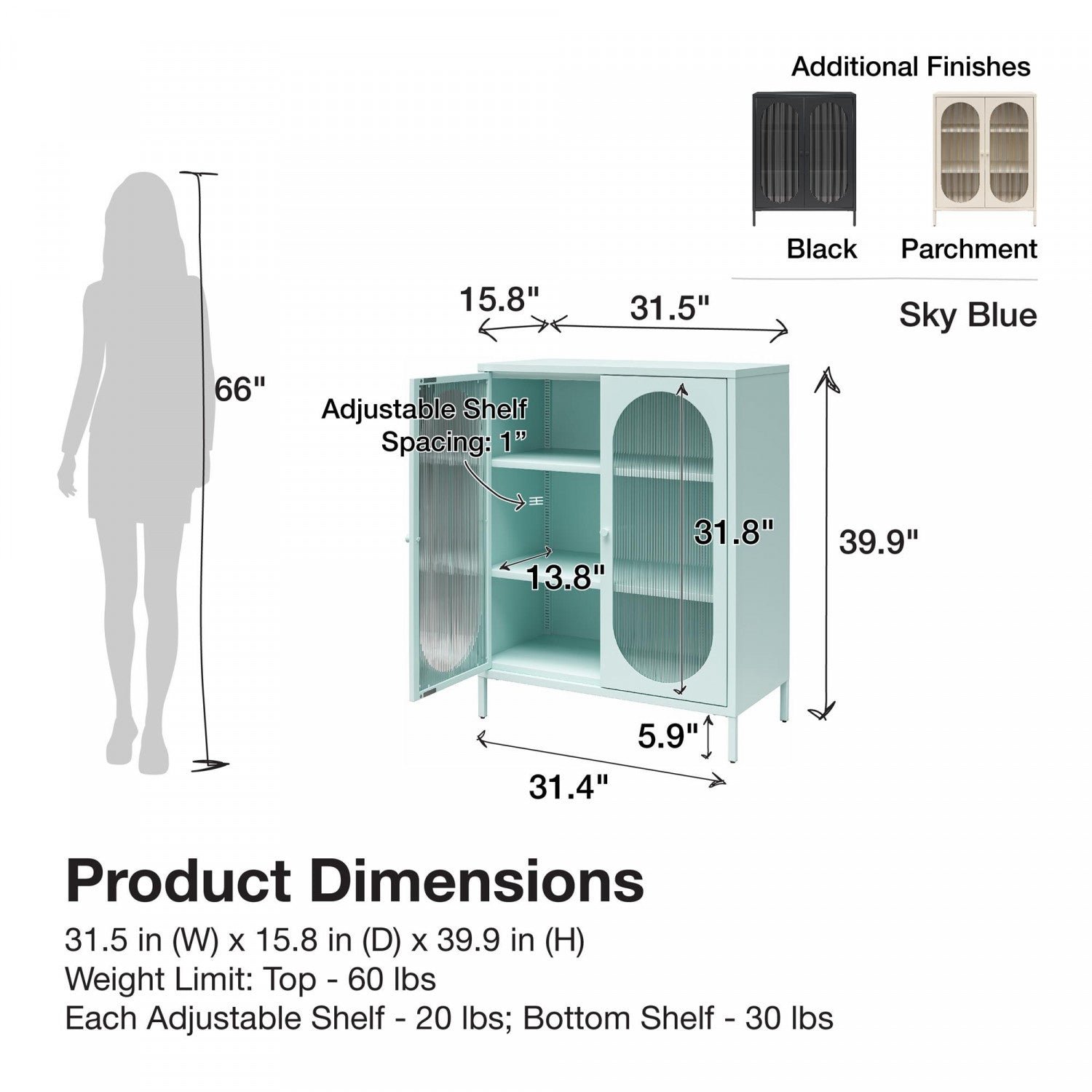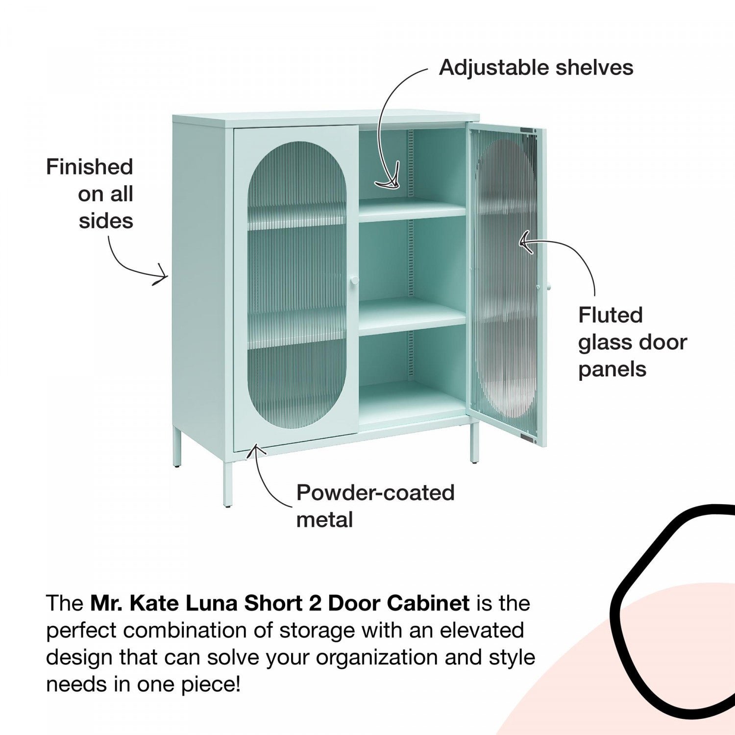 In need of a seriously cute accent cabinet to both modernize and organize your space? The Mr. Kate Luna collection is the perfect combination of storage with an elevated design that can solve your organization and style needs in one piece! The resilient metal construction really delivers in terms of versatility while the oval-shaped fluted glass doors add a distinguished charm to this dashing decorative cabinet. The short 2-door accent cabinet provides three spacious shelves (two adjustable) so you can instantly streamline and organize your living space in a flash. Add style and much-needed storage to your living room, kitchen, den, bathroom, guest room or really any room in the home! Luna accent cabinets are available in multiple colors and sizes for a perfect fit, every time. Perfect for your aesthetic: minimal, vintage-eclectic, boho.